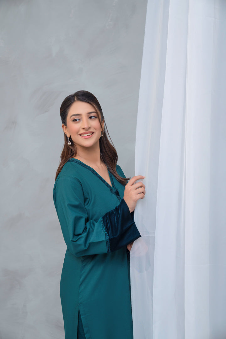- Shirt – Crafted from premium Slub Khaddar, the shirt features a delicately embellished neckline adorned with fine lace and elegant buttons, creating a refined feminine appeal. The sleeves are enhanced with a narrow lace trim and a rich velvet patch, while the daman is finished with matching lace and velvet detailing, adding depth and seasonal warmth to the design.