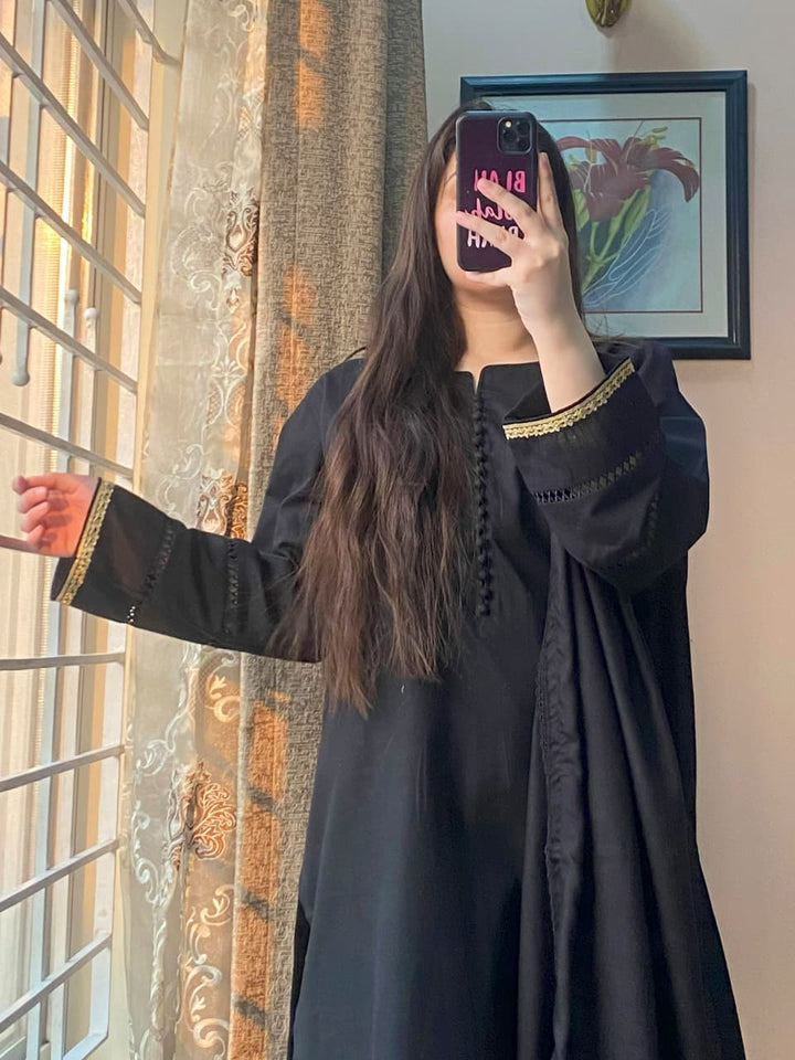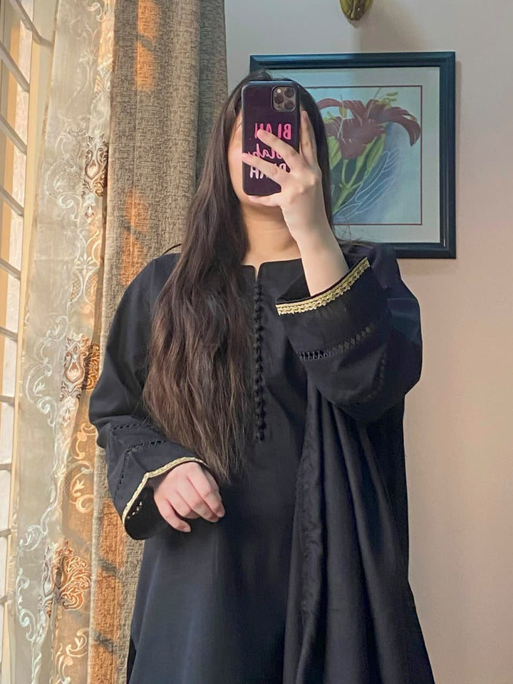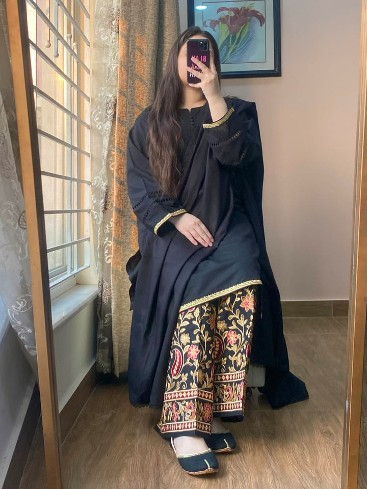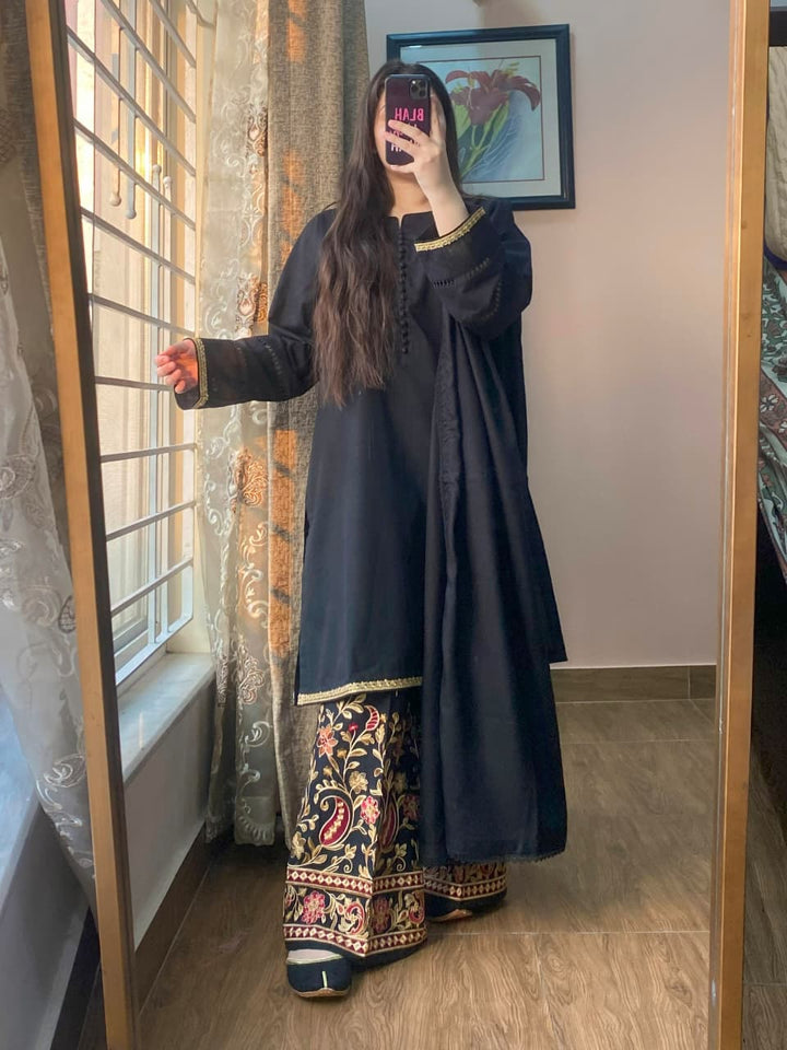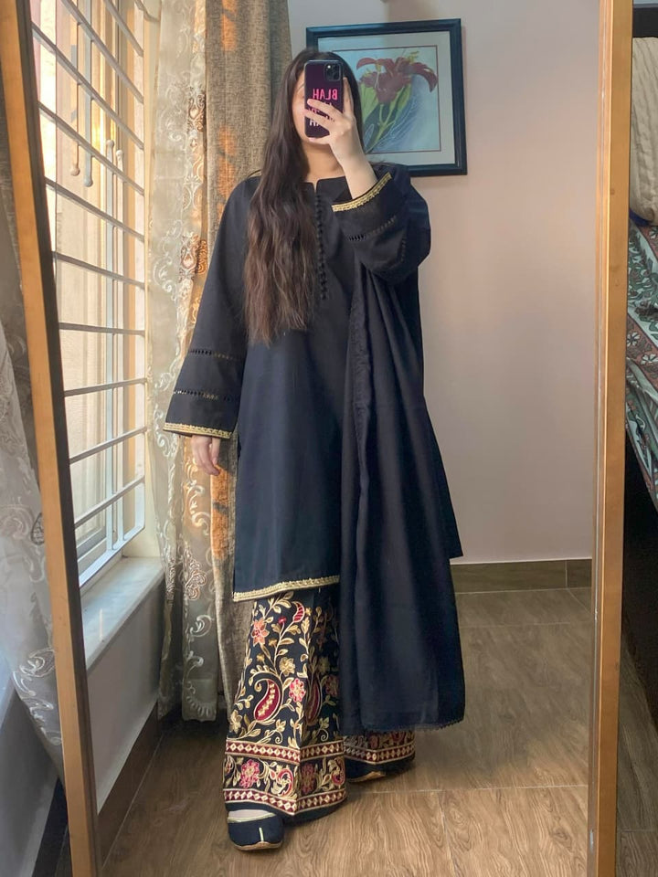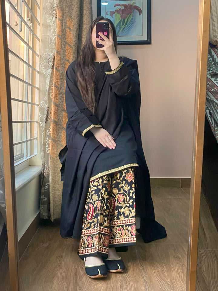 Plazo – Paired with a straight-cut plazo made from Slub Khaddar, featuring exquisite embroidery at the hem that brings a refined and artisanal touch to the ensemble. The detailed embroidery elevates the entire look while maintaining comfort and versatility.