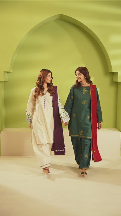 Add a touch of timeless winter elegance to your wardrobe with this beautifully designed 3-piece stitched suit, crafted from premium Slub Khaddar and paired with a warm, handcrafted wool shawl.