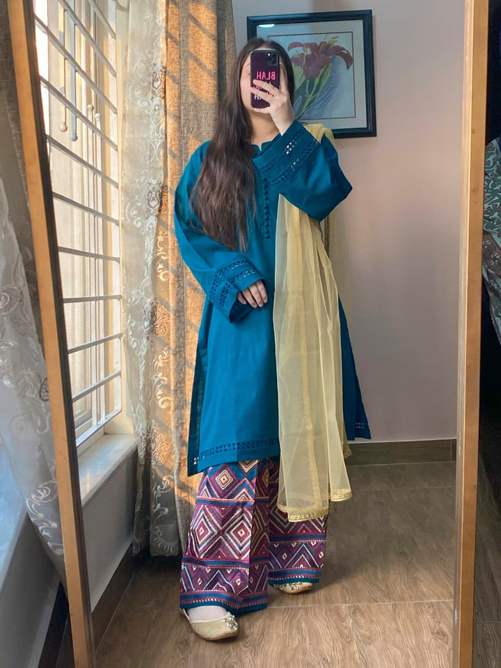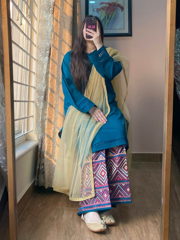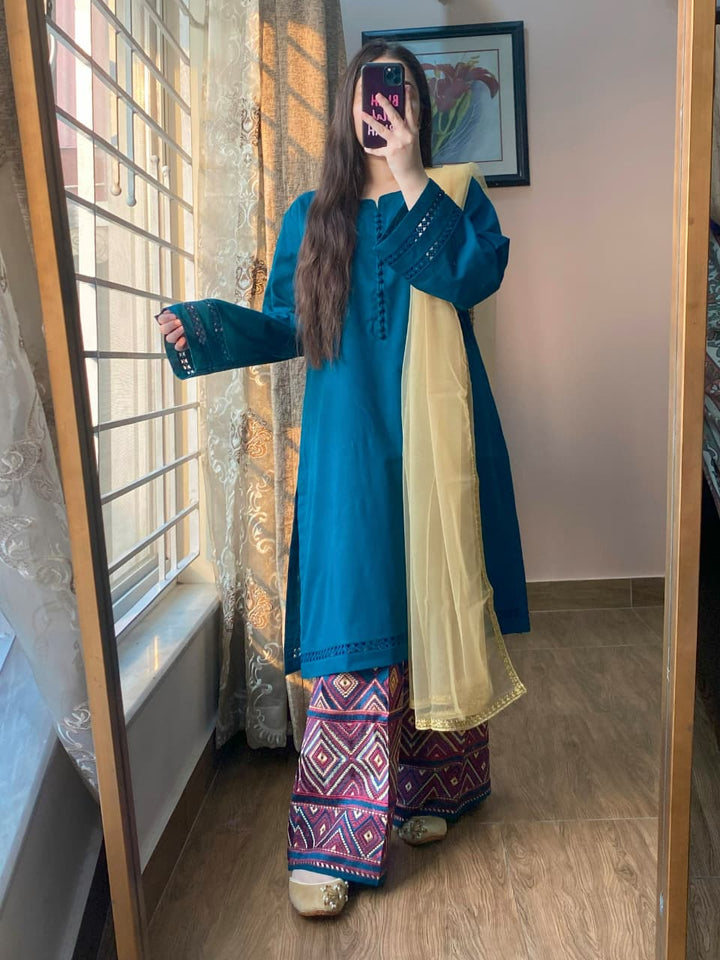 Plazo: The matching straight-cut plazo in Slub Khaddar is elegantly embroidered, adding artisanal charm and elevating the entire outfit while maintaining comfort.