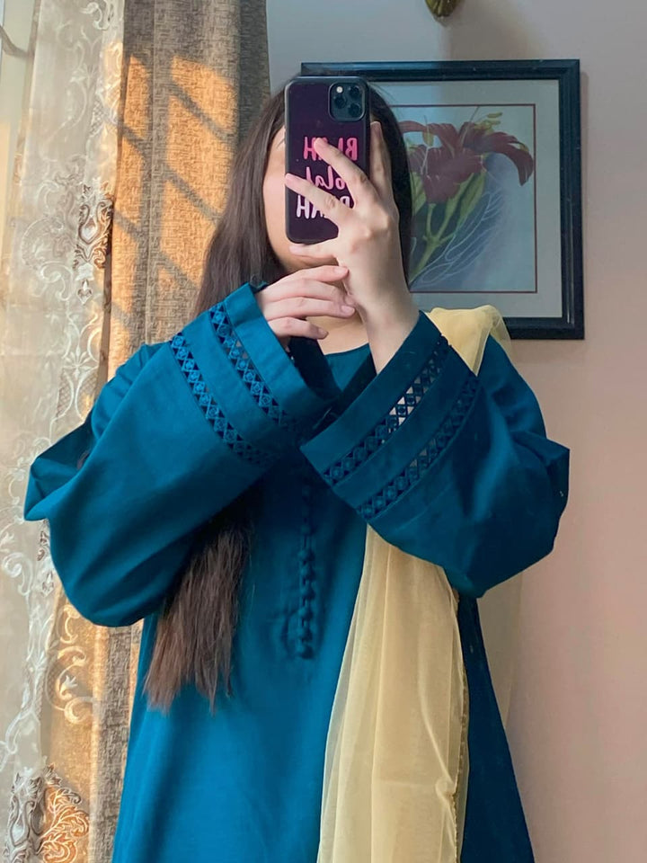 Shirt: Made from high-quality Slub Khaddar, the shirt features a classic round neckline accented with delicate buttons. Sleeves are enhanced with joint lace detailing, while the daman is finished with fine lace for a feminine, graceful look.