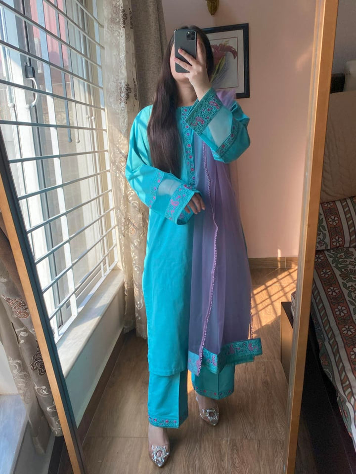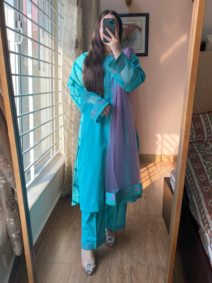 - Trousers: The straight-cut trousers in matching Slub Khaddar are both comfortable and stylish, finished with embroidery at the hem for a coordinated, polished appearance.