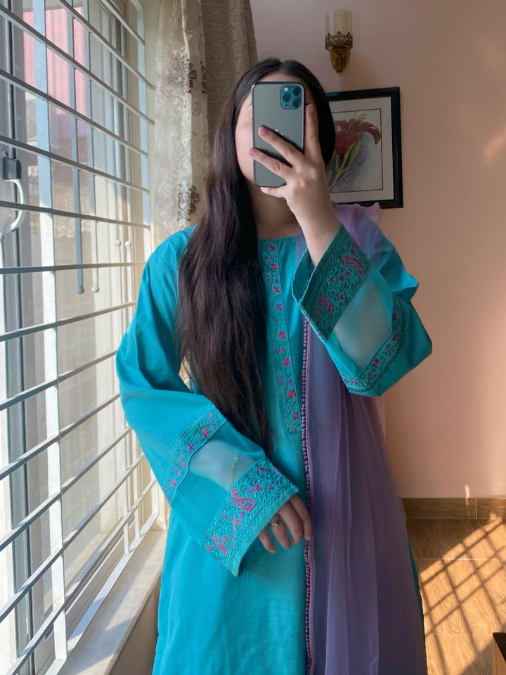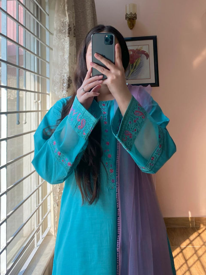 - Dupatta: The outfit is beautifully completed with a contrast Net Dupatta, adding a statement touch. Lace runs along the longer sides, while the shorter sides feature elegant embroidered patches, creating a perfect balance of softness and structure.
