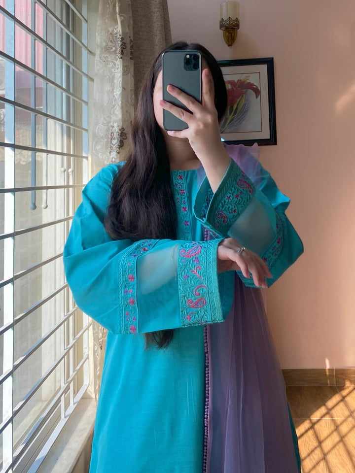 - Shirt: Tailored from soft Slub Khaddar, the shirt features a rounded neckline with an embroidered patch on the front placket, giving it a refined, graceful look. The sleeves are adorned with embroidered patches and sheer net inserts, adding texture and elegance.
