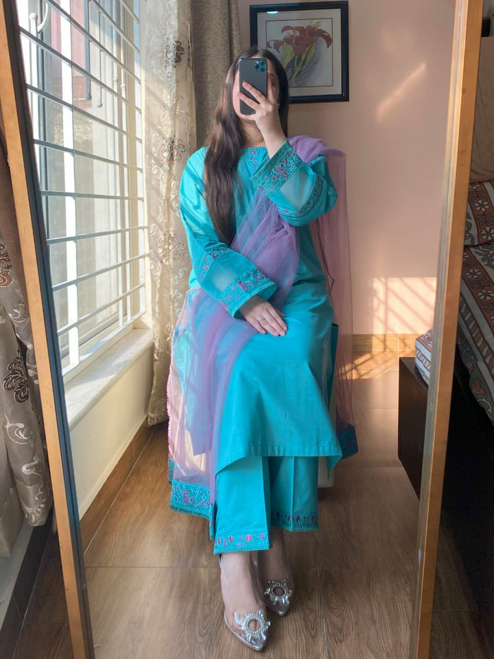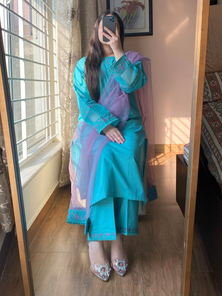 This 3-piece stitched suit blends seasonal comfort with refined detailing, perfect for winter days, festive gatherings, or elegant everyday wear. Crafted from premium Slub Khaddar and paired with a contrast Net Dupatta, this ensemble offers both style and warmth with intricate embroidery and lace accents throughout.
