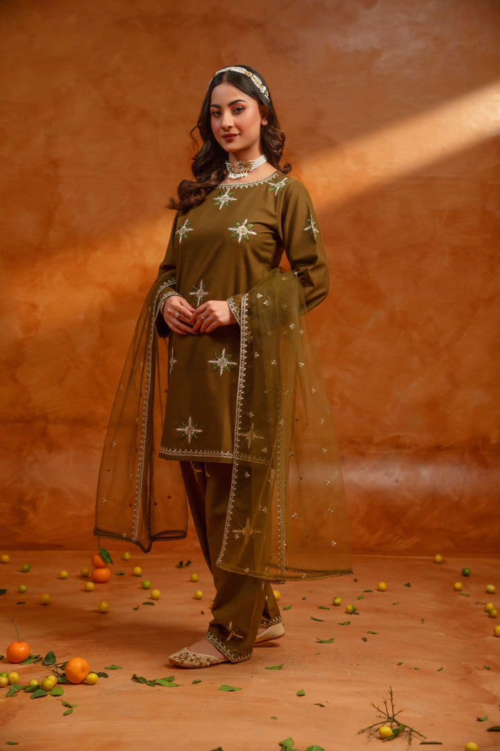 Bring timeless elegance to your winter wardrobe with this beautifully embroidered 3-piece stitched suit, crafted from premium Slub Khaddar and paired with a delicate Net Dupatta. Designed for effortless sophistication, this outfit is ideal for cozy winter days and festive occasions alike.