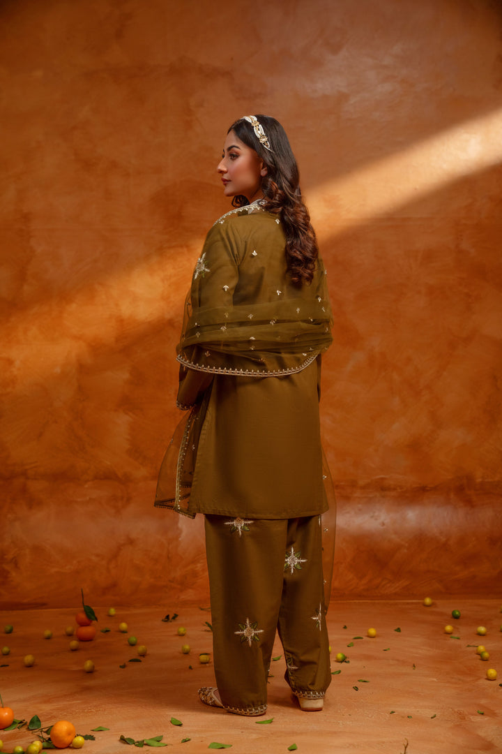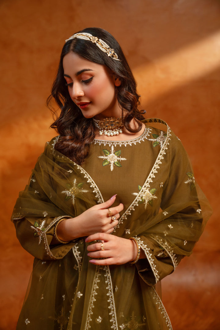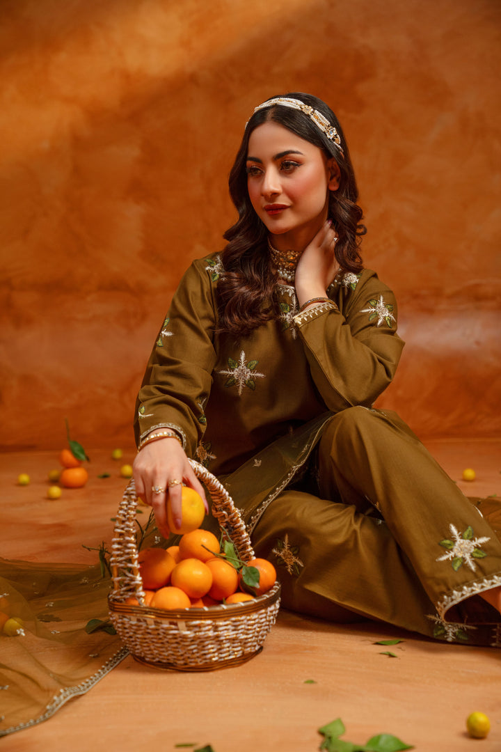 - Shirt: Made from high-quality Slub Khaddar, the shirt features fine embroidery, with embroidered borders on the sleeves and daman.