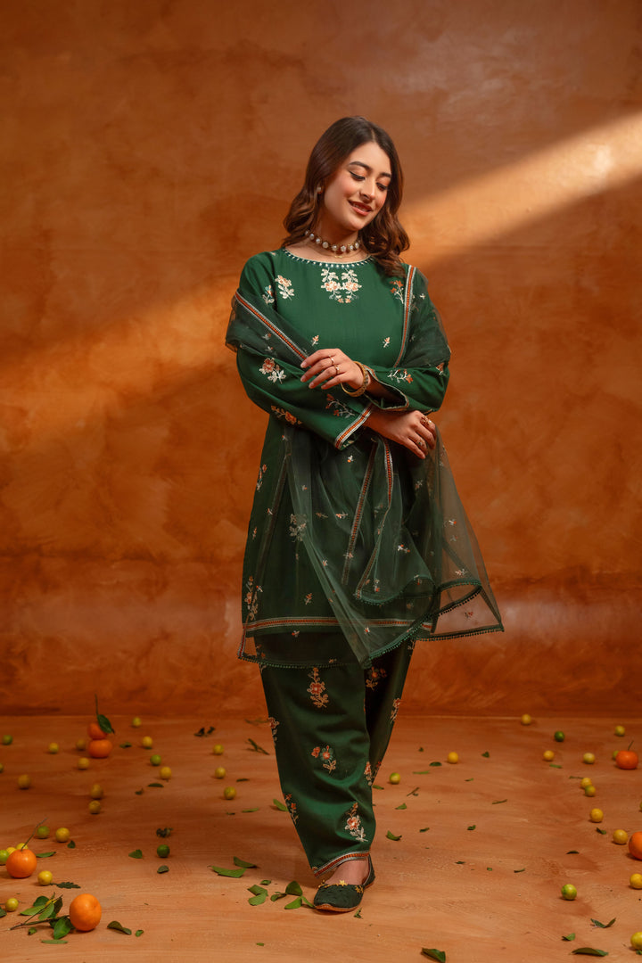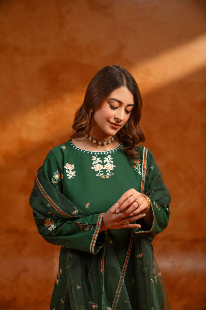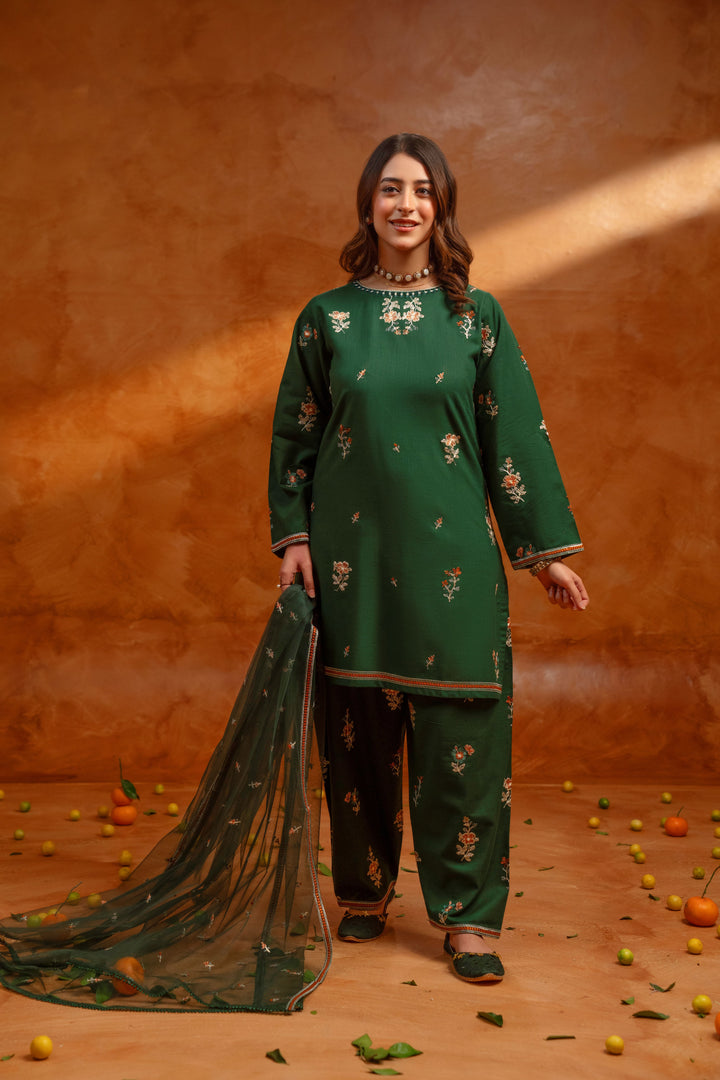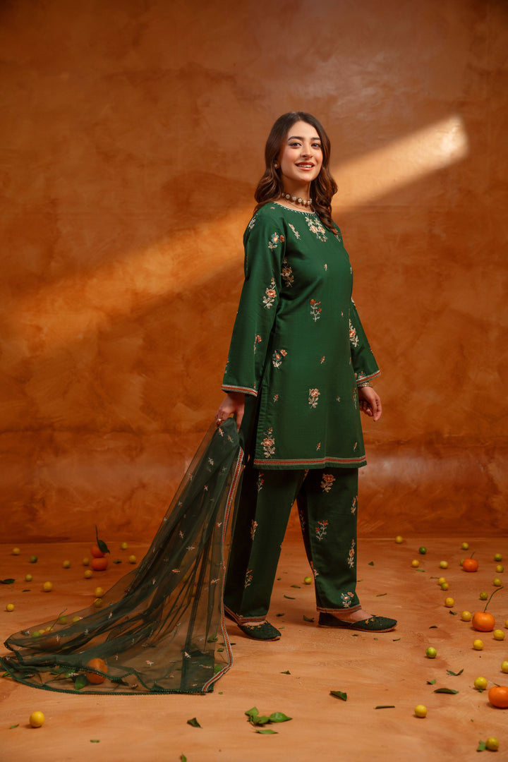 3-Piece Embroidered Slub Khaddar Stitched Suit with Net Dupatta