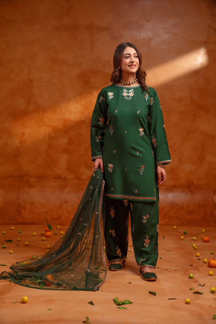Bring timeless elegance to your winter wardrobe with this beautifully embroidered 3-piece stitched suit, crafted from premium Slub Khaddar and paired with a delicate Net Dupatta. Designed for effortless sophistication, this outfit is ideal for cozy winter days and festive occasions alike.