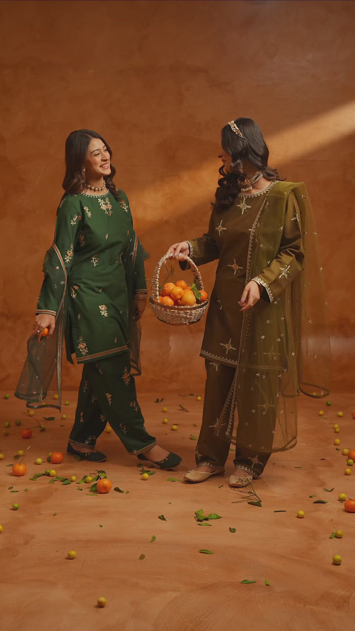 - Shirt: Made from high-quality Slub Khaddar, the shirt features fine embroidery, with embroidered borders on the sleeves and daman.