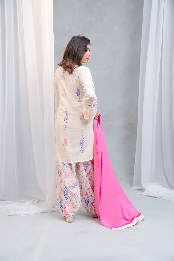 3-PIECE SLUB KHADDAR PRINTED STITCHED SUIT WITH FARSHI SHALWAR