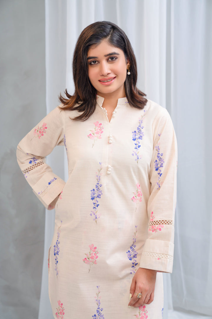 Shirt: Crafted from premium printed Slub Khaddar, the shirt features refined tailoring with a ban-collar neckline adorned with loop buttons, adding a touch of elegance to the overall design. The cut-cuff sleeves are beautifully enhanced with joint lace detailing, blending femininity with sophistication. The rounded hemline adds a graceful finish, while side pockets provide both functionality and style.