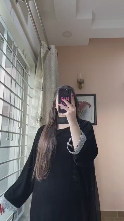 To complete the look, a lightweight chiffon dupatta adds effortless drape and movement. Two corners are elegantly finished with velvet accents and lace detailing, providing a perfect balance of texture and charm.