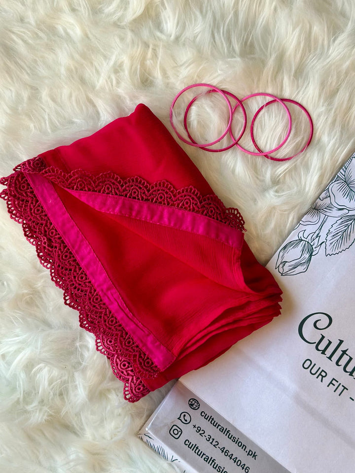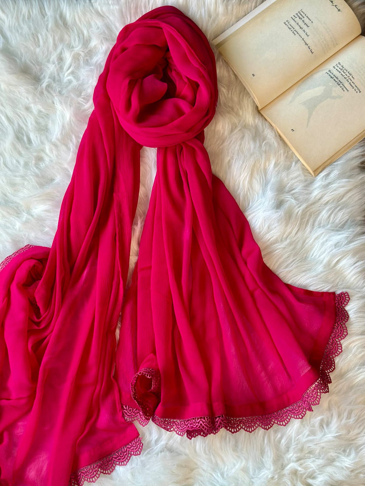 Make a bold yet elegant statement with our Deep Pink Chiffon Dupatta, designed to enhance any outfit with rich color and graceful flow. Crafted from soft chiffon and adorned with delicate lace on two sides, this dupatta adds a vibrant, feminine touch to both festive and everyday ensembles.