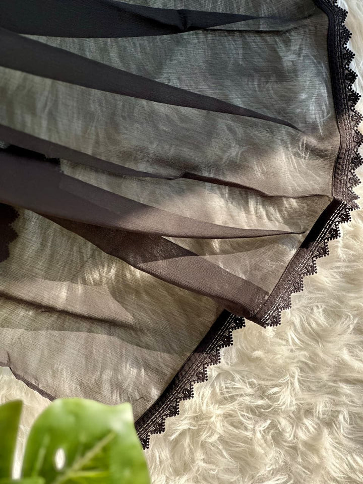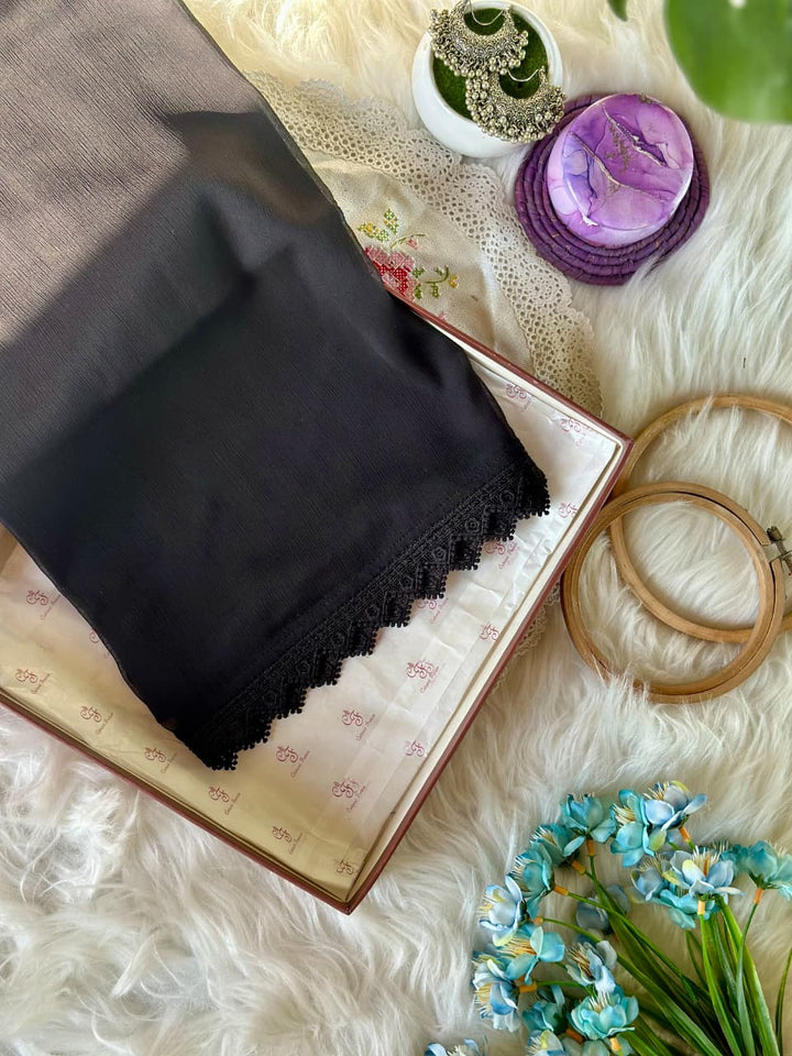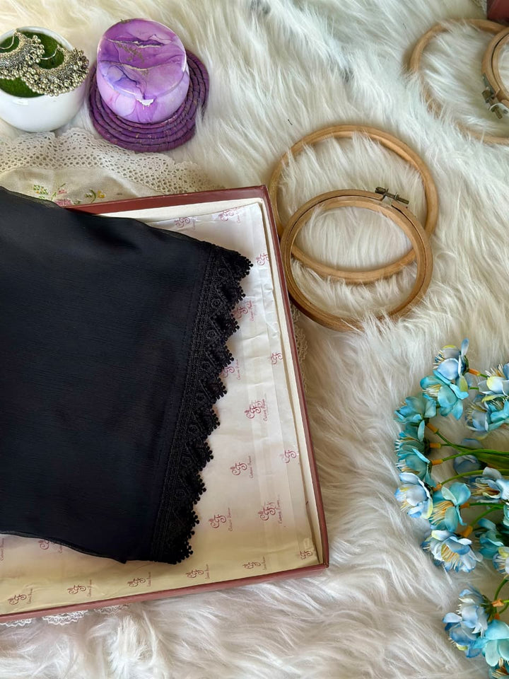 Add a refined touch to your wardrobe with our Black Chiffon Dupatta, beautifully finished with lace detailing on two sides. The soft, flowing chiffon drapes effortlessly, offering a graceful look suitable for both everyday wear and special occasions.
