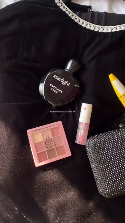 The blouse is tailored in rich velvet, providing a structured and luxurious finish, while the saree drape is crafted from flowy chiffon, creating an effortless and elegant fall. The look is further enhanced with velvet patch detailing on the corners of the pallu, adding a refined statement to the overall design.