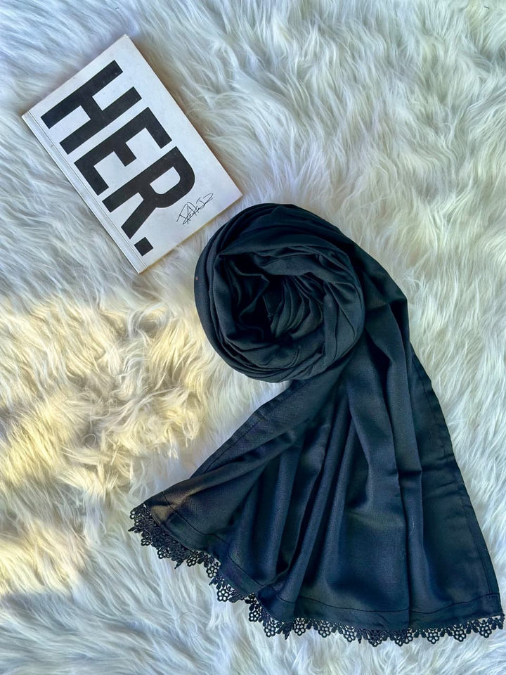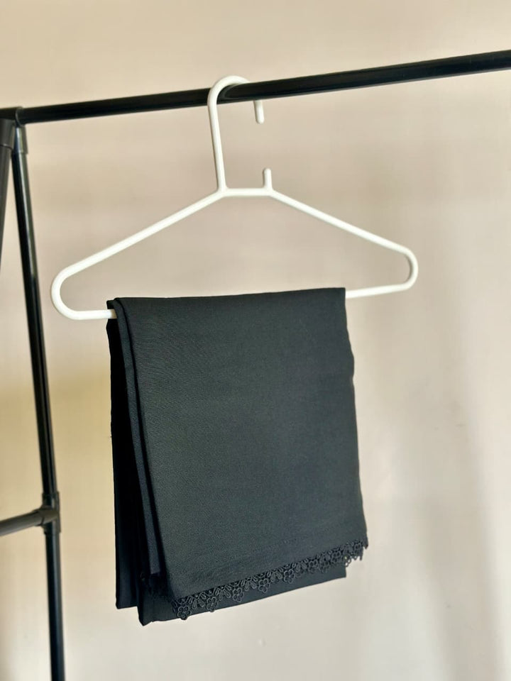 Elevate your winter wardrobe with our Black Marina Shawl, crafted from luxuriously soft marina fabric for warmth and comfort. The classic black hue exudes sophistication, while the delicate lace borders add a refined, feminine touch—perfect for effortlessly chic everyday or evening looks.