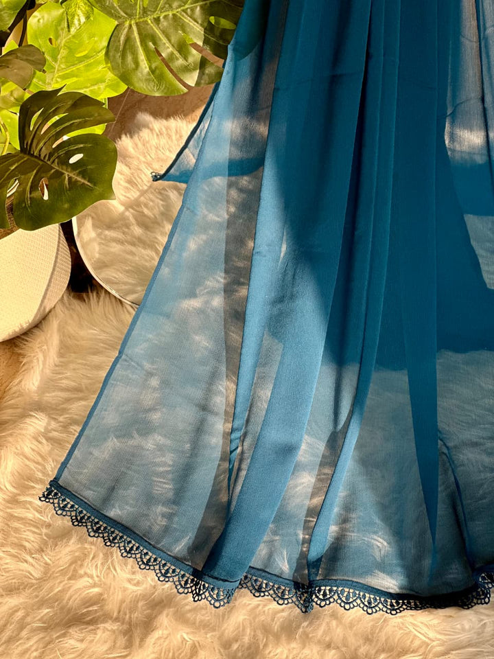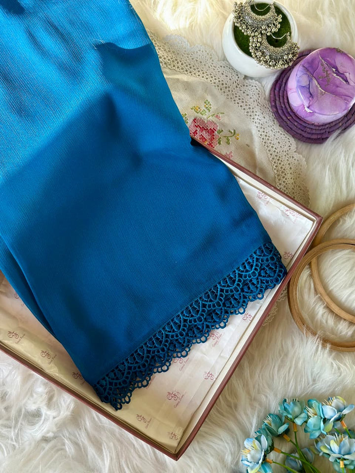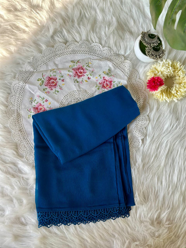 Make a statement with this stunning Zinc Blue Chiffon Dupatta, designed for those who love a touch of bold elegance. The rich zinc blue shade instantly elevates any outfit, while the soft chiffon fabric gives it a graceful, airy flow. Finished with a delicate lace border, it strikes the perfect balance between vibrant and refined.