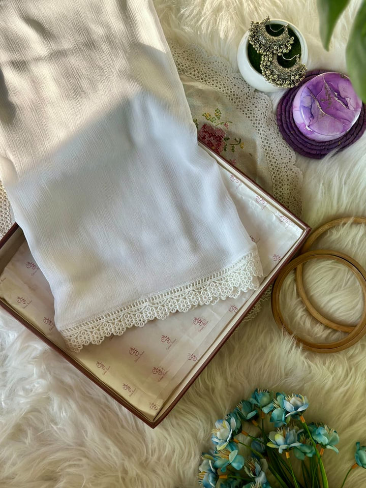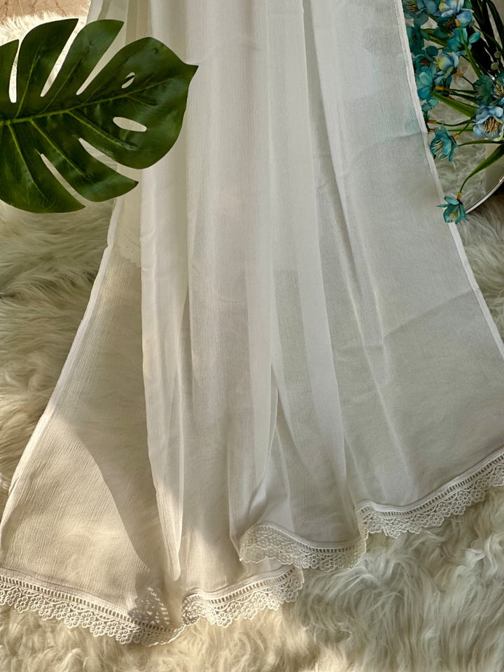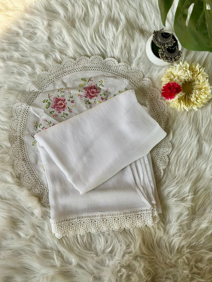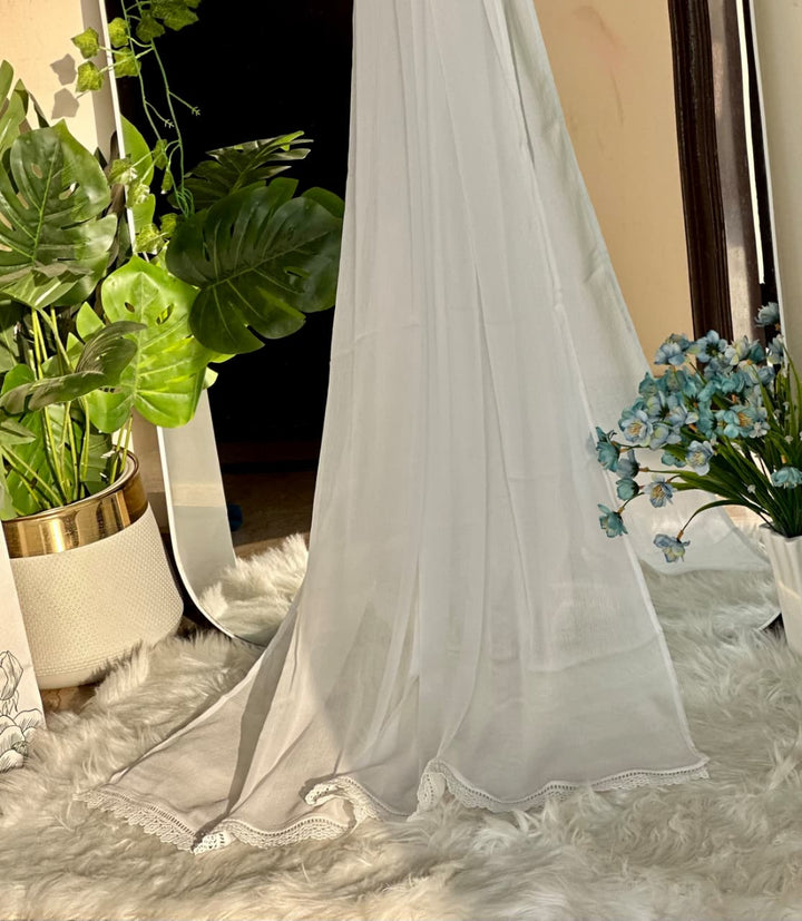 Bring timeless grace to your wardrobe with our White Chiffon Dupatta, designed in a pristine shade that pairs beautifully with any outfit. The dupatta is finished with delicate lace on two sides, adding a soft, feminine touch while maintaining the light, airy drape of premium chiffon.