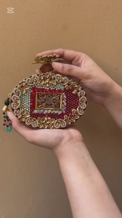 Antique-finish clutch with intricate embellishments, paired with a complementary chain for effortless elegance — perfect for festive and formal occasions.