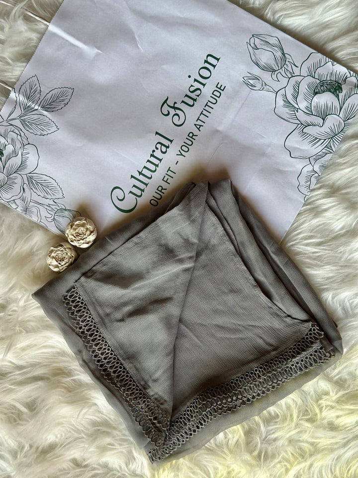 Soft in texture and sophisticated in tone, our Grey Chiffon Dupatta is made from breathable chiffon and features lace accents on two sides for a refined finish. Its versatile grey color blends seamlessly with various looks — whether you’re dressing up for a family gathering or adding grace to your everyday attire.
