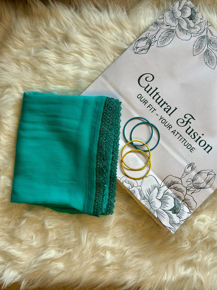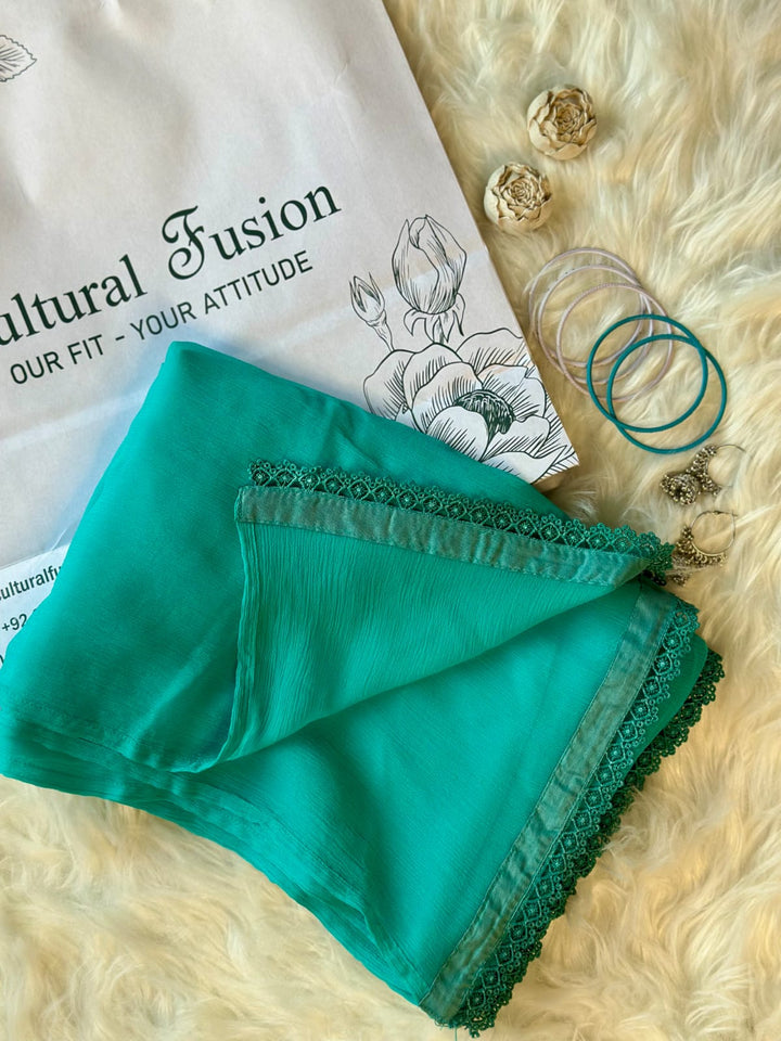 Bring freshness and elegance to your wardrobe with our Light Sea Green Chiffon Dupatta. Made from airy, soft chiffon and detailed with delicate lace on two sides, this dupatta offers a graceful drape and a refreshing pop of color — perfect for festive days, summer events, or everyday styling.
