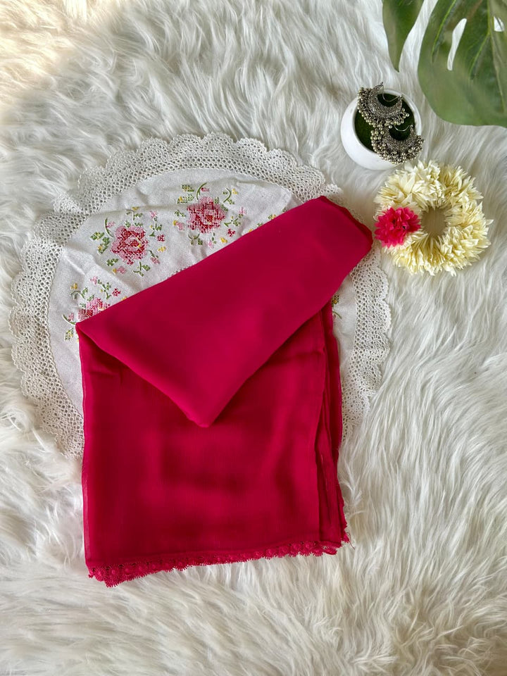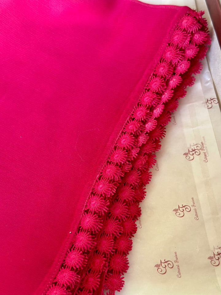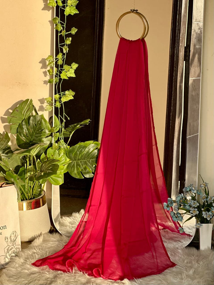 Make a statement with this deep pink chiffon dupatta, soft, airy, and gracefully flowing. Delicate lace on two sides adds a touch of sophistication, perfect for weddings, festive occasions, or giving your everyday outfit a vibrant, feminine finish.