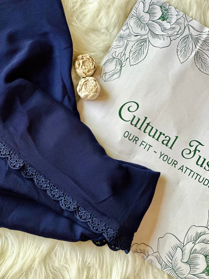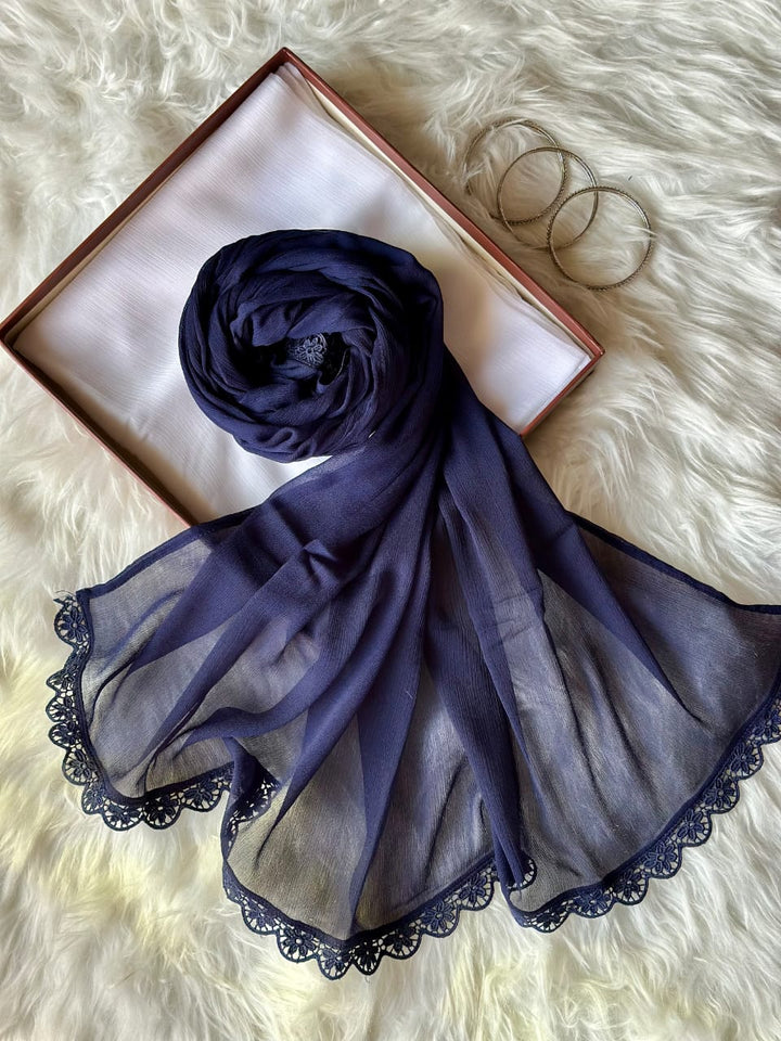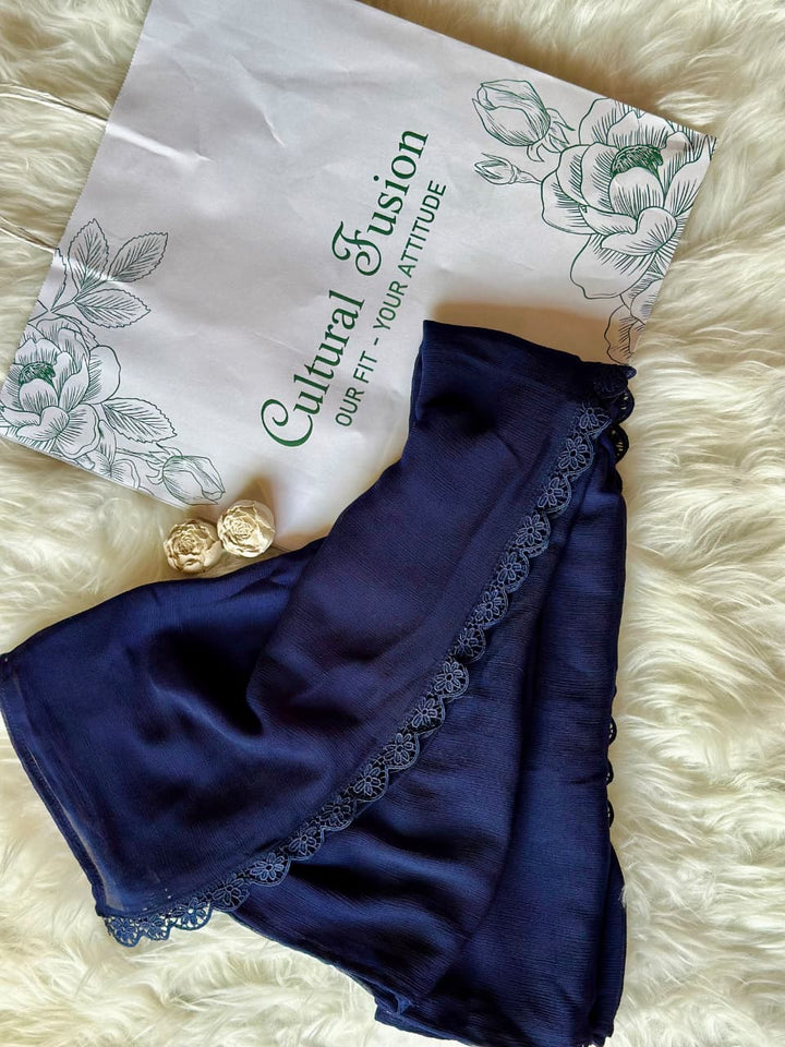 Understated elegance meets timeless charm with this Navy Blue Chiffon Dupatta. Crafted from airy, lightweight chiffon and finished with fine lace along two edges, it brings a graceful flow and subtle refinement to any outfit.
