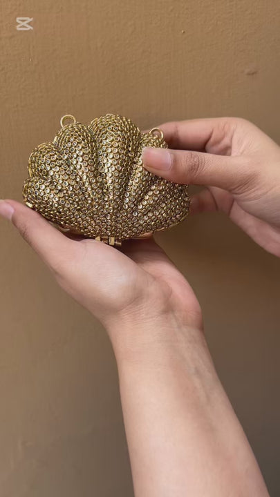 A statement luxury clutch featuring a sculpted shell design, fully encrusted with shimmering crystals for a rich, radiant finish. Perfect for weddings and formal occasions, it comes with a complementary chain for effortless carrying.