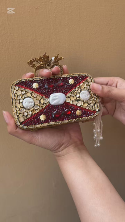 A luxurious Turkish-inspired clutch featuring intricate crystal detailing, opaline accents, and a rich statement finish. Perfect for weddings and formal occasions. Comes with a complementary chain for easy carrying.