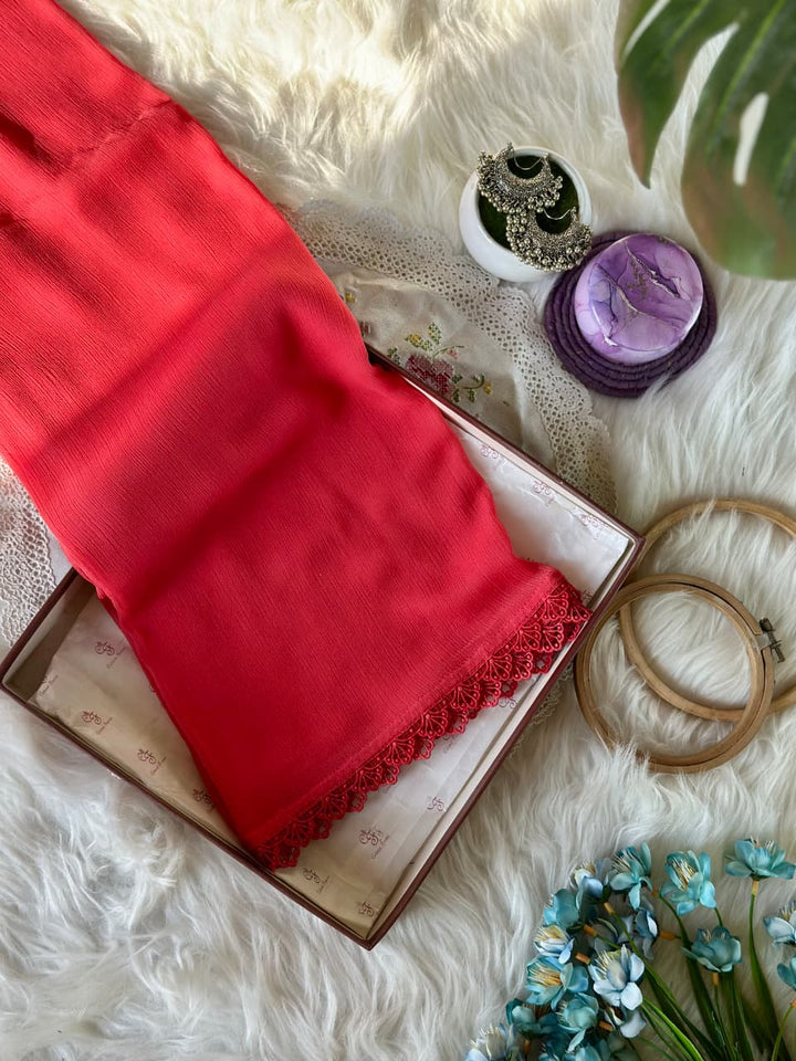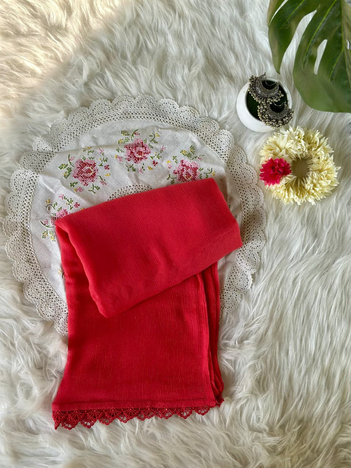 Add a pop of rich color with this crimson chiffon dupatta, adorned with lace on two sides. Its soft, flowing fabric pairs beautifully with both traditional and contemporary ensembles.