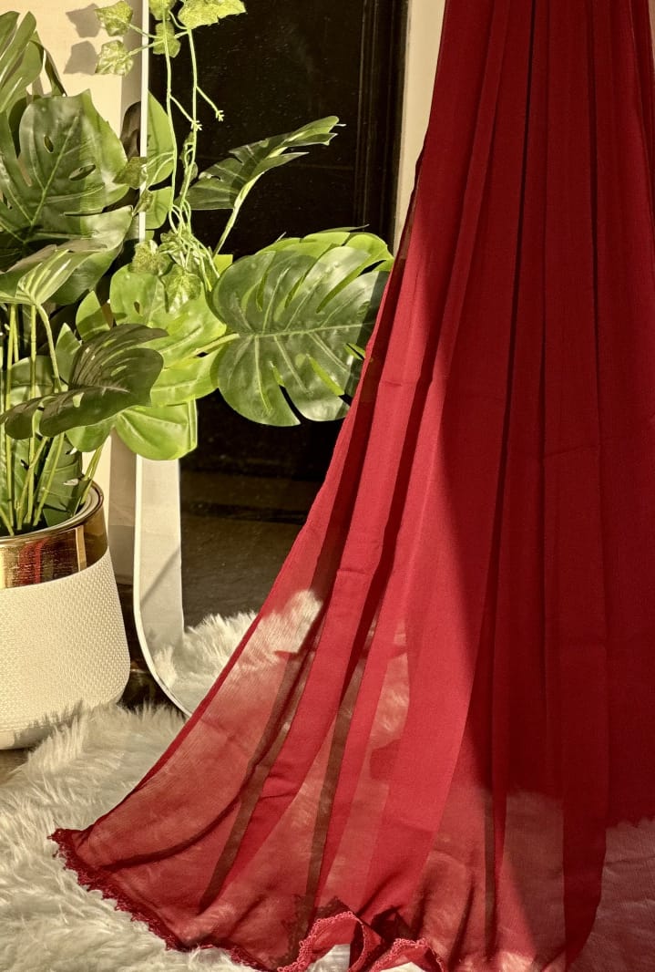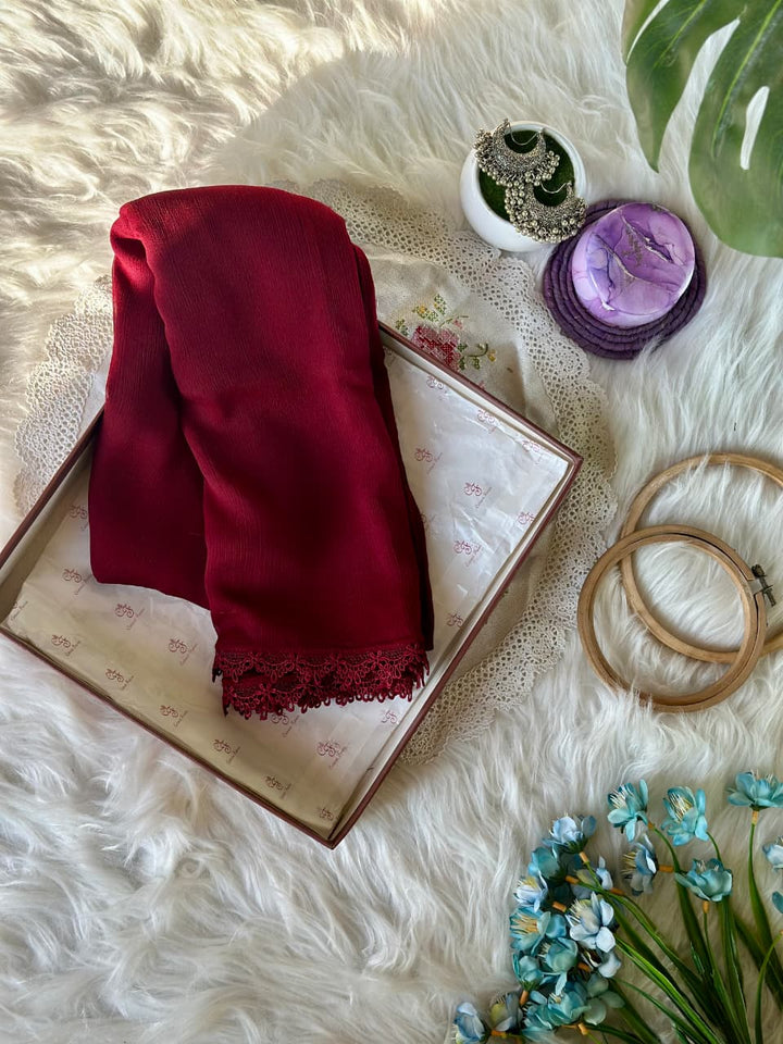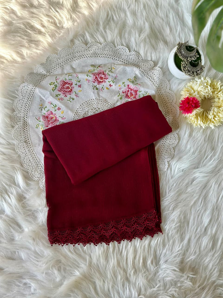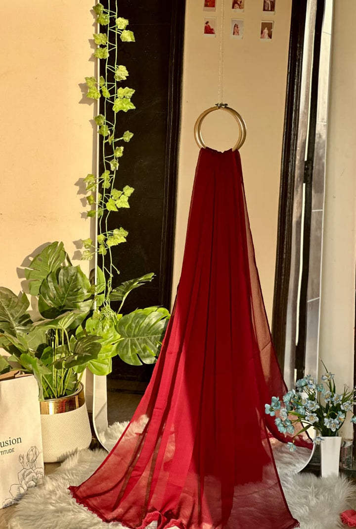 Make every outfit unforgettable with this stunning Dark Burgundy Chiffon Dupatta. The moment you drape it, you’ll feel the softness, see the flow, and fall in love with the rich, royal shade. Finished with a beautifully crafted lace border, this dupatta adds the perfect touch of grace and femininity—whether you're dressing up for a celebration or elevating your everyday style.