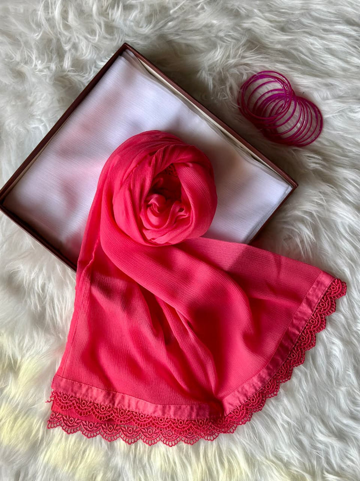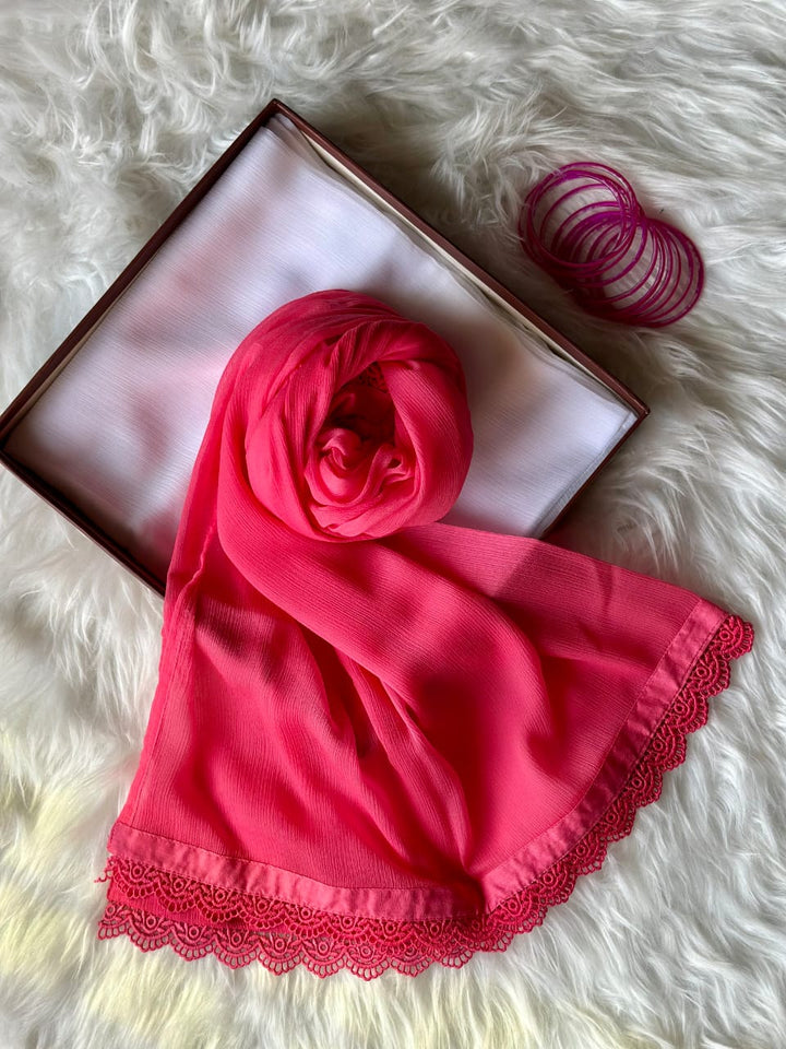 Add a pop of feminine charm to your wardrobe with our Pink Chiffon Dupatta, a perfect blend of softness, style, and sophistication. The lightweight chiffon fabric ensures a graceful fall and fluid movement.
