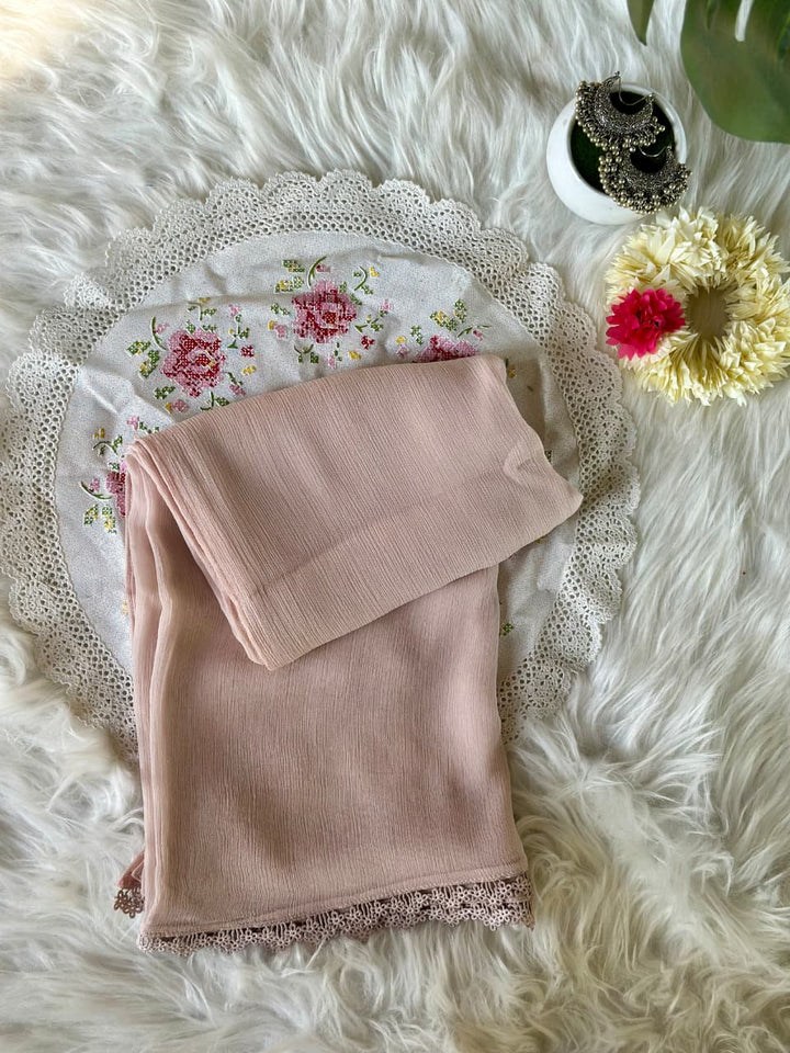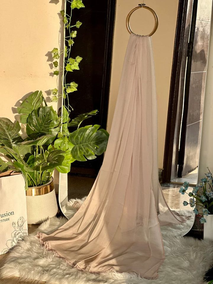 Add a touch of elegance with this light apricot chiffon dupatta, soft, airy, and effortlessly graceful. Delicate lace on two sides gives it a refined finish, making it perfect for festive occasions, weddings, or dressing up your everyday look.