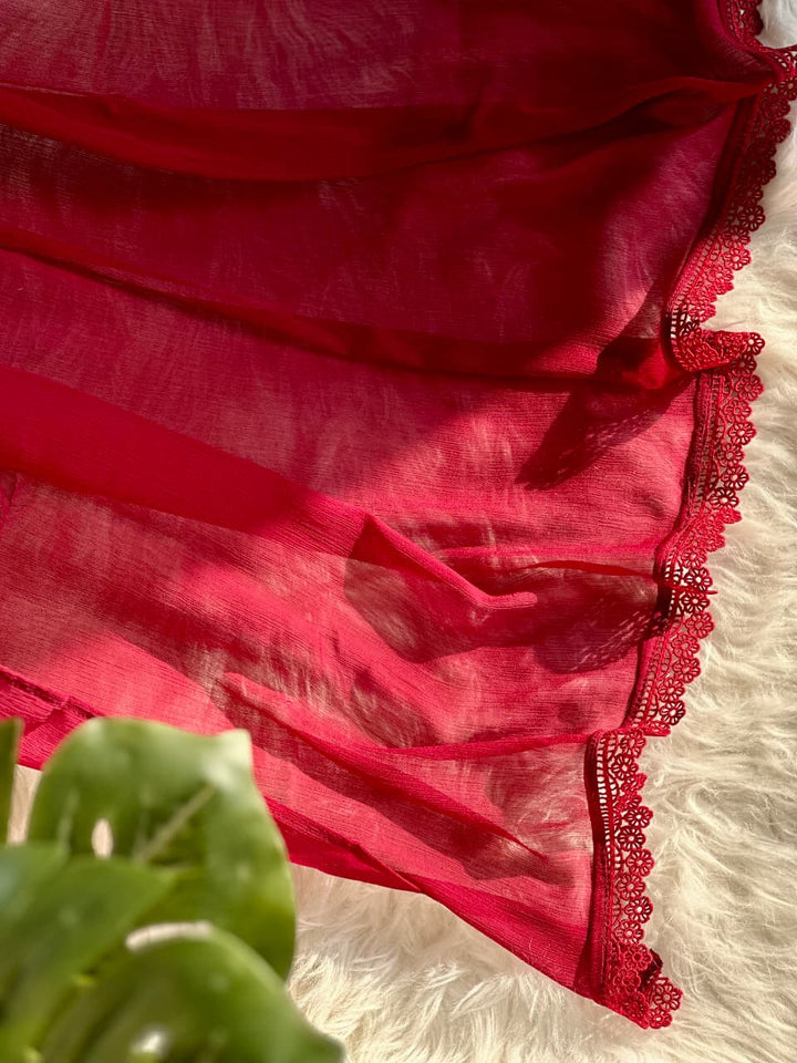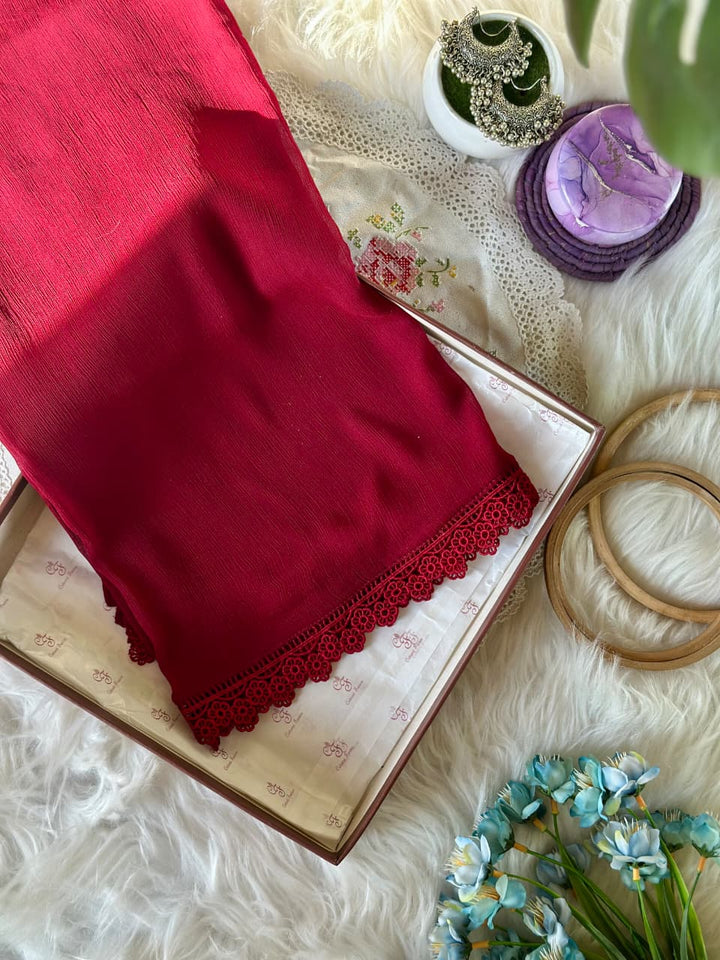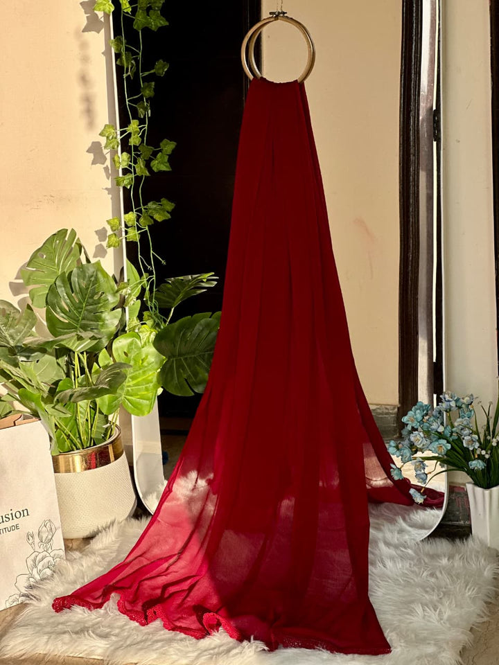 Elevate your ethnic wardrobe with our Burgundy Chiffon Dupatta, crafted in a deep, luxurious shade that adds instant sophistication to any outfit. The dupatta features delicate lace detailing on two sides, creating a refined and graceful finish while maintaining the soft, flowy drape of premium chiffon.