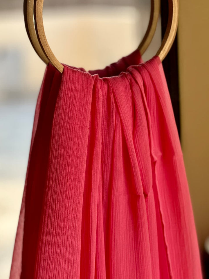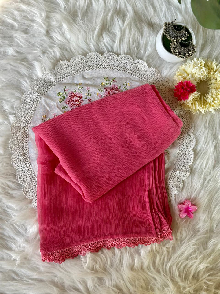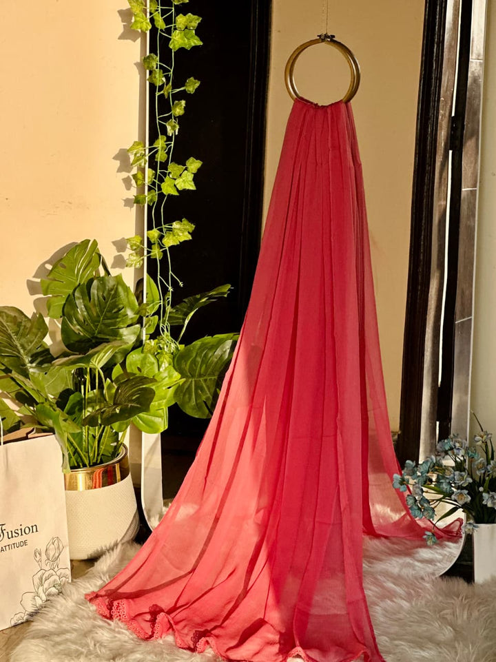 Delicate and dreamy, this pastel pink chiffon dupatta features lace on two sides for a refined finish. Lightweight and flowing, it elevates both casual and festive ensembles effortlessly.