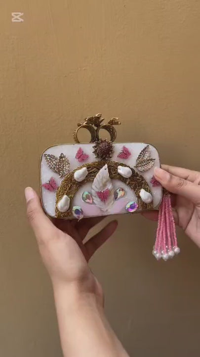 A dreamy statement clutch with Turkish-inspired detailing, pearl accents, and a gorgeous pink tassel finish. Perfect for weddings and festive nights—comes with a complementary chain for easy styling.