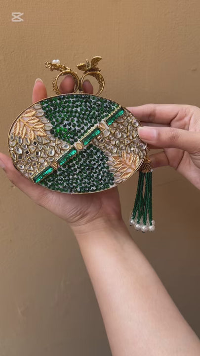 A luxurious Turkish-inspired clutch with intricate green crystal detailing, pearl accents, and elegant gold motifs. Perfect for weddings and formal occasions, with a complementary chain for easy carrying.